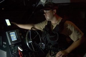 Santa Rita, Guam (Oct. 27, 2005) – U.S. Navy Master-at-Arms 3rd Class Daniel Williams, a member of Naval Base Guam Security Force’s Harbor Patrol, inspects a Global Positioning System (GPS) at the Coxswain’s Helm aboard a 28-foot harbor patrol craft. This inspection is a routine part of the pre-underway check-off list. Harbor Patrol provides waterside security for Naval assets within Apra Harbor and provides security escorts for naval vessels. U.S. Navy photo by Photographer’s Mate 2nd Class John F. Looney (RELEASED)
