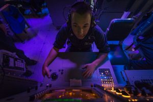 ATLANTIC OCEAN (Nov. 2, 2015) Fire Controlman 2nd Class Lance Simon monitors a radar console for air and surface contacts in the combat information center aboard the Arleigh Burke-class guided missile destroyer USS Stout (DDG 55). Stout is underway conducting routine training and operations in preparation for its upcoming deployment. (U.S. Navy photo by Mass Communication Specialist 2nd Class Edward Guttierrez III/Released)